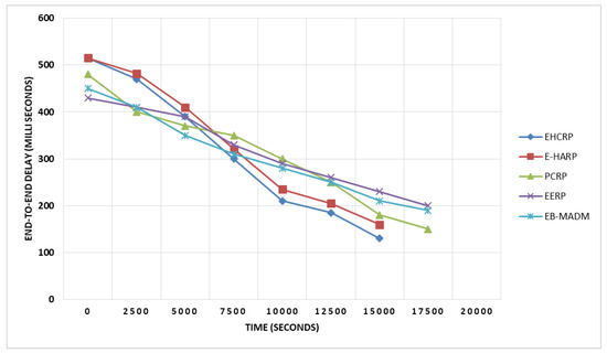 This is the time taken by a transmitted packet to go from source to destination. As WBANs are used to monitor important parameters related to human’s health, the end-to-end delay must be incredibly small to avoid any mishap. In WBANs the sensed data should move quickly to the target destination. Considering the significance and importance of end-to-end delay in WBANs, this work aimed to decrease it to a minimum level. The results of end-to-end simulation are shown in Table 8 and in Figure 11. The results demonstrate that the EHCRP protocol performs best in terms of end-to-end delay. The dual sink concept plays an important role in minimizing end-to-end delay. At the initial stage, the performance of EHCRP was almost equal to the other counterparts but later on it improved compared to its peers. At the initial stage during initialization the proposed model does a massive calculation by transmitting beacon messages due of which it performed the same as others, but after the 7500th round, the end-to-end delay decreased distinctly in EHCRP and came down to 130 ms whereas its counterparts have more delay in communication.