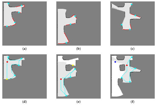 Examples of frontier segmentation. Medium gray indicates unknown cells; black indicates occupied cells; very light gray indicates empty cells; red stars are detected frontier cells; cyan dots are representative nodes; red dots are current nodes; yellow dots are unexplored next targets; the blue dot is the next explored target; cyan lines show the solution to the traveling salesman problem (TSP) for the current node and its child nodes: (a) Local map constructed at the root node (b) local map constructed at the root node’s first child node (c) local map constructed at the root node’s third child node (d). A single map is used at the root node to discriminate real frontiers. (e) The local maps of the current and parent nodes are merged. The previous node is the parent node. The root/parent node’s second child node is not at the frontier area in the merged map, and is eliminated from the exploration target list to obtain a new observation. (f) The local maps of the current, parent, and previous nodes are merged. The previous node is the sibling node.