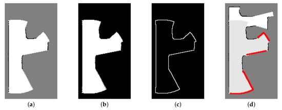 Frontier cell detection: (a) Local grid map. (b) Empty region of local grid map. (c) Internal boundary of empty region extracted by morphological operations. (d) Safe frontier cells (red stars) on merged map.