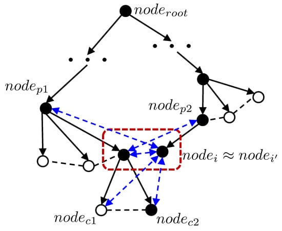 We define the root node’s ID to be 1, and its parent’s ID to be 0. Because the robot essentially starts the exploration process in an empty region, the root node does not appertain to any frontier segments: the third component in Equation (1) is ∅. is the information concerning the relative transformation from to , and consists of the shortest distance, , between the two nodes and the geometric relative transformation vector, . A general tree structure only has directed edges between the parent and child nodes. In our frontier-graph structures, all child nodes have one parent node, and there are edges between the parent and child nodes. Moreover, because we can compute the relative transformations between child nodes when new child nodes are detected on the local grid map, there are edges between child nodes, i.e., sibling nodes.