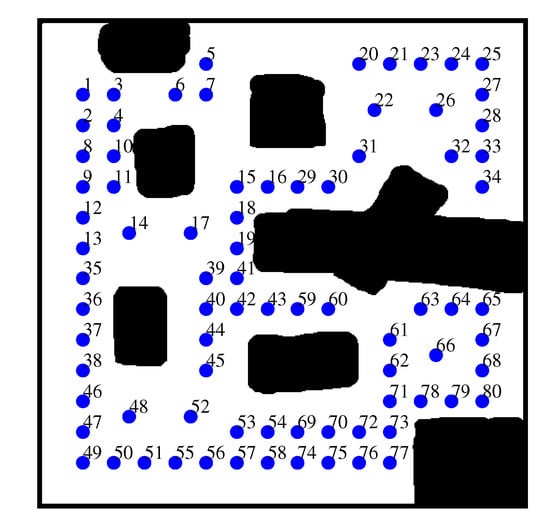 We used a publicly available cave-like environment [35] for this comparison. All the simulations were performed in Matlab. We assumed that the robot has a laser range finder (LRF) that scans in all directions (360) around the robot. We assume that the SLAM algorithm gives the robot’s state in the global reference frame at every decision step in all simulations, because we focus on the exploration method itself in this paper. However, we only use the SLAM global state to calculate the relative transformation between the frontier nodes. Our local map-based exploration does not depend on SLAM’s global information, and is performed using local information about the frontier nodes, which will be merged incrementally as the exploration proceeds. To merge the local grid maps, the overlapped regions are updated using Bayes’ rule [36]. Figure 5 shows the environment used in the simulations. The robot started the exploration process at 80 different positions (blue dots) for each exploration method. The starting positions were extracted by quadtree cell decomposition [37]. The size of the environment was 20 × 20 m, and it was simulated as a 500 × 500-pixel array. Each local map was constructed using grid cells of 0.1 × 0.1 m size.