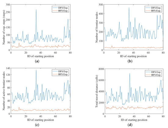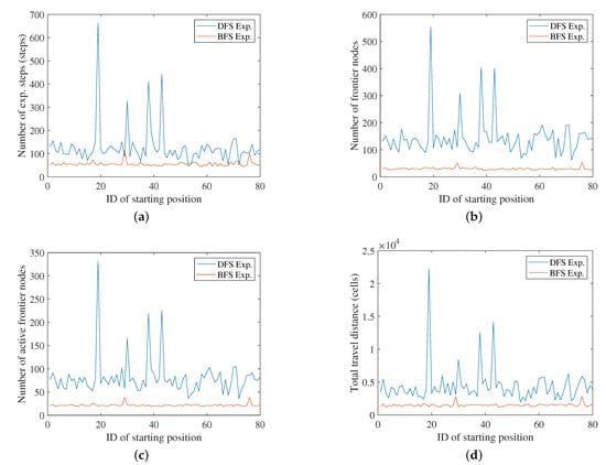 Table 3 and Table 4 explicitly show the effects of varying the starting position for each method. The ratio of the maximum value to the minimum value ranges from 9.0 to 14.4 in the case of DFS-based exploration with 4 m LRF. The DFS exploration’s maximum travel distance is extremely high, 22,278 cells. However, the ratio of the maximum value to the minimum value ranges from 2.0 to 2.6 in the case of BFS. this is relatively low compared to that of DFS-based exploration. In the case of the results from 8 m LRF, the maximum-minimum ratio is in the range 4.4–6.4 for DFS, while it is in the range 1.7–3.1 for BFS.