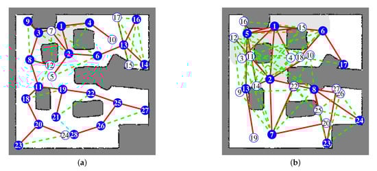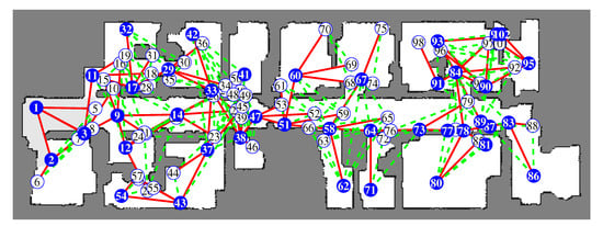 Figure 8 shows the resulting frontier-graph structure. The numbers indicate the ID of each frontier node, and ID-1 is the root node and starting position. The starting positions are the same in both simulations. The red lines show the edges between the parent and child nodes. The dotted green lines indicate the edges between sibling nodes. The blue circles are the active frontier nodes, at which the robot arrived and obtained local maps. The white circles are the nodes that were registered to the frontier-graph, but the robot did not visit. In both results, the entire environment is represented by well-distributed frontier nodes and edges between them. We also carried out simulations using another benchmark environment, Freiburg 079 building [35]. This environment is composed of a corridor and several rooms, and its size is 40 × 13.8 m. The 4 m LRF was used, and the grid map was constructed from 0.07 × 0.07 m grid cells. We can see that the frontier nodes are distributed throughout the environment in Figure 9.