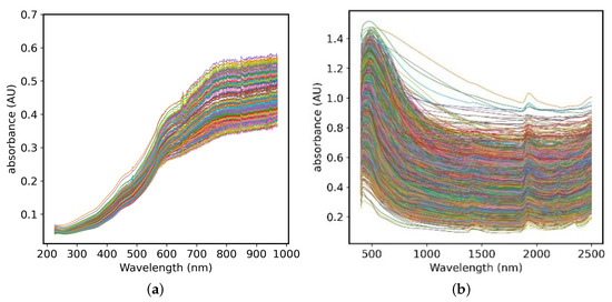 The large-scale soil data set LUCAS is composed of 19,036 soil sample data collected from 23 European countries, including cultivated land, grassland, woodland and other land types. The soil samples are quite different [8]. After the soil samples are also air-dried and sieved, they are measured by a FOSS XDS (Foss, Denmark) near-infrared spectrometer. The spectral characteristics are recorded with a spectral resolution of 0.5 nm to obtain 4200-dimensional data with a wavelength range of 400 nm–2500 nm. The LUCAS dataset tested a variety of soil properties, such as coarse debris content, organic carbon, nitrogen, potassium, phosphorus, pH, clay, and so forth, so this article selected three soil properties from the LUCAS data set, including organic carbon (OC), nitrogen (N) and Clay, the basic information of the two data sets is shown in Table 1, which shows the diversity and difference of LUCAS sample data. Figure 1 shows the original soil vis-NIR spectra of the two data sets, where the horizontal axis is the wavelength range and the vertical axis is the absorbance of the soil sample.