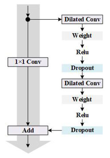 Convolutional Neural Networks (CNN) is a nonlinear model, and its unique convolution and pooling structure can extract essential features from complex input information, so it has excellent model characterization capabilities. It is usually composed of multiple convolutional layers, pooling layers and fully connected layers. The convolutional layer is a linear calculation layer that uses a series of convolution kernels to convolve with the input data. It can reduce the number of parameters of the whole model by taking advantage of the localization and positional independence of the features in the input data. The pooling layer is mainly used for feature dimensionality reduction, compressing the number of data and parameters to reduce over-fitting and improve the fault tolerance of the model. The fully connected layer uses neurons to fit the data distribution and improve the model learning ability. Temporal Convolutional Network (TCN) is an innovative network structure that combines the best practices extracted from convolutional neural networks. It transforms into a model suitable for sequence data by combining one-dimensional full convolution and causal convolution [23]. The residual structure of the TCN model connects causal convolution and dilated convolution, and its structure is shown in Figure 4. It includes two dilated convolutional layers, and WeightNorm and Dropout are added after each layer to achieve regularization. The dilated rate of each dilated convolutional layer increases exponentially with the number of levels, ensuring that the convolution kernel covers all inputs in the effective history information, and also ensuring that the use of deep networks can generate extremely long effective history information.