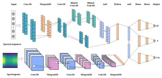 The first input of the model is mainly preprocessed spectral sequence data. By referring to the time convolution network suitable for time series modeling, a one-dimensional convolution network is built to predict multiple soil attributes, and it is named Multi_CNN_1D. The first layer of a one-dimensional convolutional network is a one-dimensional convolutional layer with 64 filters. ReLU is used as the activation function and the convolution kernel weight is normalized to train the network more stably. After that, the BN layer is added, and the maximum pooling layer is used for the down-sampling operation. The third layer is also the convolutional layer with 128 filters. Then the residual module is constructed, which includes two dilated convolutional layers with dilated rate of 2 and 4, and a one-dimensional convolutional layer with exactly the same parameters. Then the fully connected layer connects all the outputs of the previous layer to all the inputs of the next layer and performs information integration. The spectrogram is trained by using a three-layer two-dimensional convolutional layer and adding a pooling layer in the middle, which can reduce the parameter dimension and prevent network overfitting. Then, the feature data type extracted by the dual-stream CNN is converted through the Flatten layer, and finally the prediction results of the three attributes of the soil are output through the three-branch fully connected layer. The network structure is shown in Figure 5, and the specific parameters of the model are shown in Table 2.