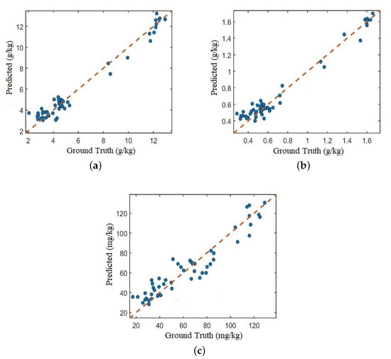 In order to further verify the effectiveness of the proposed algorithm, this paper selects Qingdao soil spectral data measured in different periods, which contains 500 data samples, and the selected soil attributes are also TC, TN, and AN. The small samples are preprocessed and input into the adaptive network Multi_CNN. Finally, the modulus evaluation parameters of the three attributes are 0.91, 0.98 and 0.95, and the is 0.17, 0.02, and 2.21. The three soil attributes are shown in the Figure 11. A scatter plot of the predicted value and the actual value of the attribute obtained by laboratory method analysis. It can be seen that the scattered points are evenly distributed on both sides of the regression line, which proves that the Multi_CNN network has high predictive ability and generalization ability.