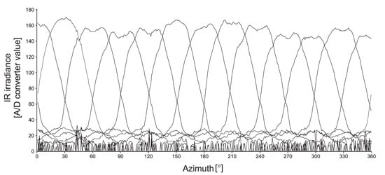 After the measurement has been made, the stepper motor rotates one half-step, or in this case for 0.9° in the clockwise direction, and the procedure repeats for all 360°, i.e., for 400 half-steps. The obtained data consists of a true AoA taken from the known position of the stepper motor and 12 × 400 IR measurements taken from 12 phototransistors for each of 400 different AoA.