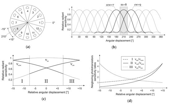Finally, calibration measurement data is used to calculate all three ratios for any given angle. Strictly speaking, for each of 12 different sections (Figure 4a), i.e., for each triplet of neighboring sensors (m, ccw, cw), calculated ratios from measured values are fitted with polynomials and only coefficients of corresponding polynomials are stored for the estimation. Since all polynomials are monotone (Figure 4d) in the segment they are used, the estimation algorithm itself is reduced to a simple binary search.
