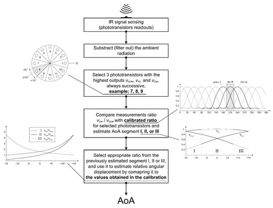 Once phototransistors indices m, cw, and ccw are selected, further AoA estimation is performed in the range [−15°, 15°], relative to the orientation of phototransistor with the maximal value vm. After measurement data are obtained, the estimation is performed by selecting one ratio and matching its value with calibration data. The selection of the ratio that is used in the estimation depends on the segment of the given range in which AoA is being estimated, and this itself can be estimated using the default vcw/vccw ratio.