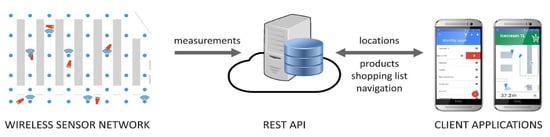 Navindo indoor navigation system. (1) Wireless sensor network with nodes deployed at fixed locations (i.e., above aisles in the supermarket) and simple IR transmitters (tags) on mobile objects that are being located—carts. (2) Application programming interface (API) that provides support for managing both the location data and the information about the target navigation area. (3) Client mobile applications used for accessing, managing, and visualizing location data.