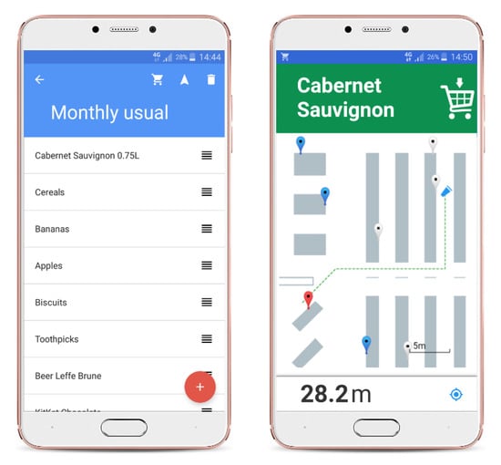 Our showcase application assumes enriching in-situ shopping experience by providing cart localization and navigation services within supermarkets aisles. Supporting this context is motivated by current customer demands, as well as by recent trends that suggest increasing involvement of modern technologies within the shopping process, i.e., smart shopping []. According to a 2016 study by ECE [], a German project manager for shopping centers, end users want to utilize digital services in brick-and-mortar stores. The study showed that, among people younger than 40, every third person needs some sort of in-store guidance system. Billa, one of the most famous Austrian supermarket chains, has a mobile application that utilizes Bluetooth Beacon technology for providing location-based promotions in 11 selected shopping venues. French multinational retailer Carrefour, as well as Target, the second-largest discount store retailer in the United States, both invested in VLP-based indoor navigation prototype solutions, to assist their customers in finding what they are looking for more easily [,].