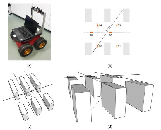 Having in mind that the cart’s true position can be outside of the aisles graph, the goal of the third experiment (E3) was to evaluate the localization accuracy of the proposed solution in a more realistic Mobile-2D context. This time we set the robot (Figure 18a) on a 7.7-m-long path within the specially designed topology wherein 6 sensors were set in a 2D mesh (Figure 18b). This topology determines the corresponding aisles graph on which the robot can be localized by our solution. All sensors were positioned 3 m above the IR transmitter level. In order to make the experiment setup similar to the supermarket scenario, the given route was positioned between the shelf mock-ups made of cardboard boxes. Altogether, six “shelves”, each 220 cm high, were thus used to simulate the target context (Figure 18c,d). Although there were three people in the laboratory during the experiment (two experiment administrators and a robot operator), we did not formalize any intentional user movement in that space. Hence, the MP effects were not specifically analyzed.