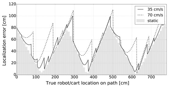 Given that the used AT-3 robot can easily maintain a constant speed on the straight line, we opted for the linear trajectory once again, which allowed simple calculation of fine-grained ground truth 2D locations in real-time. The robot traveled along the same trajectory with constant velocities set as in the Experiment E2 (70 cm/s, 35 cm/s). Additional static localization, like in the E1, was performed with a 10 cm resolution on the same path. Localization errors obtained in the given E3 setup are presented in Figure 19.