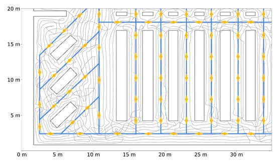 For an 80 × 38 m supermarket layout, we designed a WSN topology with exactly 301 IR AoA sensors that were simulated according to the real characteristics of the 16 prototype sensors. We distributed simulated sensors along the virtual corridors so that every location in the supermarket has at least one sensor in the IR transmitter range. The corresponding aisles graph was constructed according to the store layout and the designed WSN topology. In the described setup, we inserted a large-scale cart trajectory that uniformly covers available movement space for the given layout. This 5000-m-long trajectory was obtained using the ergodicity-based coverage algorithm [], targeting the homogeneous area coverage of the simulated cart locations. We simulated shopping cart movement along the given trajectory using three speeds: 35 cm/s, 70 cm/s, and 140 cm/s. Ground truth locations from simulated trajectory were compared to estimated locations provided by WSN, and localization error was thus inspected. Table 3 summarizes the results of the E4 evaluation.