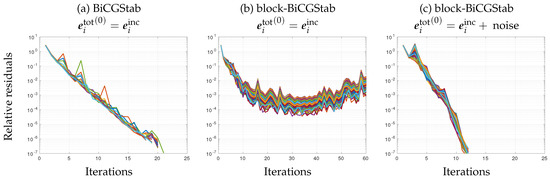 Then, as described in Section 3.2, noise with 50 dB SNR was added to the initial solution of block-BiCGStab. The corresponding iterates are shown in Figure 2c—BiCGStab iterates, which are not represented, behave similarly to those represented in Figure 2a. On the contrary, block-BiCGStab iterates now converge much faster: in this example, block-BiCGStab converges in 40% less iterations than BiCGStab, corresponding to a similar saving in terms of computation time.