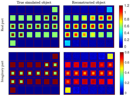 We finally consider the reconstruction of the five objects of the Fresnel database [54]. Such objects have already been reconstructed in many papers [27,28,29,61,63,64]—see also a summary of reconstruction results in [65]. Due to space limitations, we restrict the presentation to two objects, which can be considered as the two most difficult ones: the TwoSpheres and the Cylinder objects.