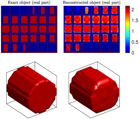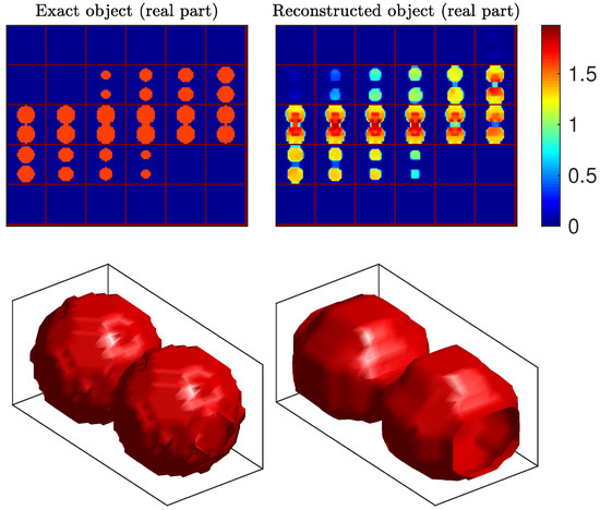 The TwoSpheres object was composed of two identical spheres in contact embedded in air, 50 mm in diameter and with uniform, real-valued, relative permittivity equal to , that is, contrast . Figure 4 (top) shows 30 slices of the true object and of our corresponding reconstruction, and Figure 4 (bottom) represents the isosurface of the reconstruction at the contrast value . Note that we only present the real part of the estimated contrast function because the estimated imaginary part was very small. The latter is presented in the supplementary data files. It can be observed that the shape of the object was well reconstructed, even at the contact point. The contrast value was slightly overestimated at the contact point (the estimated contrast was about 1.8), and slightly underestimated around it (the estimated contrast was about 1.3).