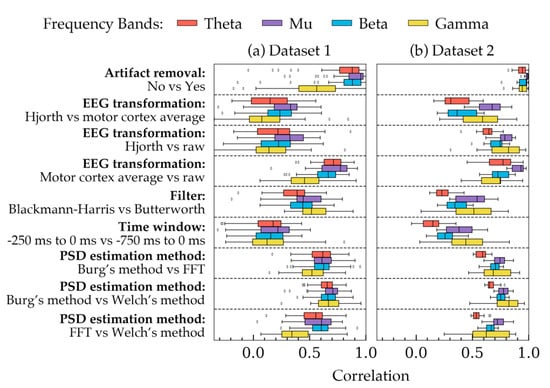 Correlations between different choices of each method are demonstrated for all subjects in both datasets. Each frequency band was considered separately while calculating the correlations. The four bands are highlighted with four different colors. For each method (presented in each row), the remaining methodological choices were kept constant as follows: artifact removal = yes, EEG transformation = raw, filter = Butterworth, time window = 750 ms, and PSD estimation method = Welch’s method. The boxes indicate the quartiles of the samples while the whiskers extend to show the rest of the distribution up to 1.5 inter-quartile range. The dots indicate the outliers. (a) The correlations obtained from all subjects of Dataset 1. (b) Correlations obtained from all subjects in Dataset 2.