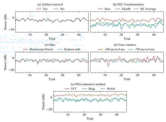 Figure 2 and Table 1 demonstrates group level variations of PSDs. To illustrate some examples of these variations within individual subjects, Figure 3 and Figure 4 were plotted. Figure 3 shows the trial to trial power variations within the beta frequency band of a random subject in Dataset 1. The variations were the result of selecting different choices within each of the five factors of signal processing methods. Each subfigure in Figure 3 was plotted to contrast choices in a method while all other method choices were kept constant. The constant values of the choices were the same as that in Figure 2. Figure 3 indicated that there were variations in some trials, even though the overall trend of the powers were same for most choices. Choices in artifact removal and filters seemed to produce least variations in trials. EEG transformation and PSD estimation method choices seemed to produce an offset, particularly when Hjorth transformation (Figure 3b) and FFT method (Figure 3d) were used. Time window seemed to produce drastically different PSDs (Figure 3d). Visualization in Figure 3 was mostly consistent with the results obtained from Figure 2 and Table 1, which showed that the choices in EEG transformation and time-window produced the most pronounced variations (ignoring offsets) of power. However, unlike Figure 3, the models in Table 1 indicated significant variations can arise due to the choices in artifact removal.