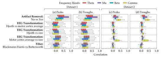 Figure 5 shows the correlation coefficients between all possible choices in the methods of phase estimation. The two phase groups are shown in different subplots: peaks (Figure 5a,c), troughs (Figure 5b,d). Taking all subjects into account, each row shows how the effects of choices in a method were correlated with each other. The remaining methods were kept at a constant choice the rationale for which is the same as that of Figure 2. In Figure 5, a difference in standard deviation was evident between the two datasets: phases of Dataset 2 showed smaller standard deviations than that of Dataset 1. However, overall, both of the datasets showed similar trends in the correlation plots with an exception in the gamma frequency band. Additionally, Figure 5 shows that artifact removal, in this case, had the least effect on phase estimation, since with and without artifact removal seemed to result in relatively stronger correlations between the phases.