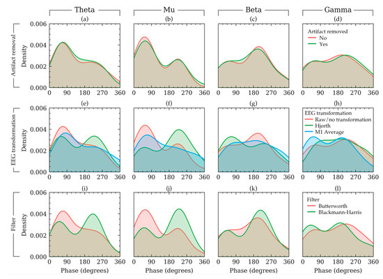 To visualize some examples effects of the three methods on the phases of an example subject, the density plot of the phases of EEG signals of a random subject in Dataset 1 is presented in Figure 6. In this figure, each row shows the effects of choices available in a method keeping the other methods constant. The rationale for the constants is the same as that of Figure 2. Figure 6 shows that the phases had a bimodal distribution. It also shows that the choices in EEG transformation and filter affected the output phase values nonlinearly across the four frequency bands. For example, in beta frequency band (Figure 6g), if raw signals were used, the trough phase trials outnumbered the peak phase trials. However, such phenomenon was not apparent for the other frequency bands (Figure 6a,b,d). Similar non-linearity can be found for filter selection (Figure 6i–l). The visualization of Figure 6 agrees with the results from Table 2 and Figure 5, which indicated that EEG transformation and filters affect the phase quantities substantially. The choices in EEG transformation and filter algorithms produced substantially different distributions for the subject in Figure 5.