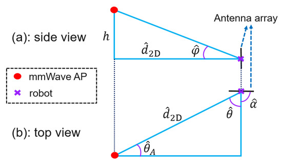 Illustration of geometric relationships between the robot and mmWave AP from two points of view.