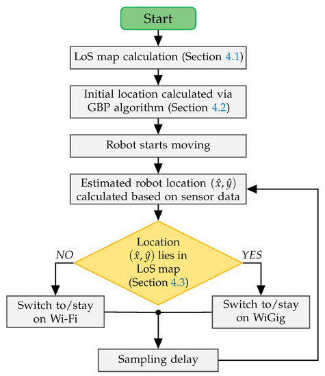 In addition, traditional RSSI hysteresis and time triggers may be used to eliminate possible ping-pong effects [10]. However, in this paper we use a “proof of concept” scheme, which only takes into account the current estimated location of the robot, and triggers a handover when the robot crosses the LoS-NLoS border. Assuming that we know the map of the building and the LoS border, together with the current location of the robot, the task of predicting if the robot is in the LoS area becomes in checking if it is located inside the polygon of an arbitrary shape, i.e., points in polygon (PiP). Since the observed polygon can be non-convex, the most efficient way to solve the problem is via a ray intersection method with the complexity of , where N represents the number of edges in the considered polygon [50]. In order to decrease the computing power requirements, the LoS area polygon should be calculated separately (using e.g., Blender) for each mmWave AP in the deployment scenario, while the checking algorithm should be applied only for the currently used AP.