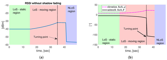 Simulation-based numerical characterization as a function of time along the simulated robot trajectory (see Figure 3b). (a) The received signal strength indicator (RSSI) applying InH office pathloss model ([52] Table 7.4.1-1); (b) Noiseless AoA with respect to mmWave AP.