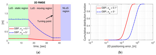 The array orientation measurement is assumed to be corrupted by an un-biased Gaussian error with the standard deviation of that is set to two different values in the simulation campaign. Specifically, the curves in Figure 7 manifest the difference in terms of the obtained positioning accuracy at two different orientation error statistics ( [51]), which reflects the impact to the LRMs that stems from the stable or coarse orientation measurements obtained from a six-axis sensor on the robot. As it is observed in Figure 7, the positioning accuracy by GBP is generally higher for a smaller orientation error statistics , as well as when the robot approaches the mmWave AP owing to the fact that for a given AoA measurement error, the robot suffers a smaller positioning error when it is closer to the mmWave AP. In other words, the AoA measurement error is translated into a larger/smaller positioning error at a larger/smaller UE-AP distance. It is also worth noting that the RMSE curve stops when the robot enters the NLoS region, thus indicating the fact that the communication with the mmWave AP is discontinued when the LoS is blocked.