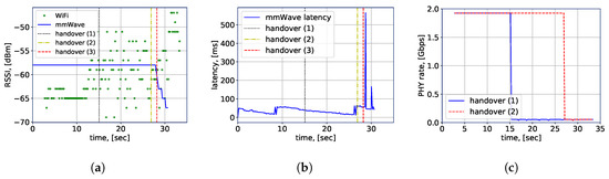 The connection-related performance is displayed in Figure 8, where the horizontal axis represents the timeline of the handover experiment starting from 0 s. With the black, yellow and red vertical lines, the time of the RSSI-based (1), location-aware (2) and preferred (3) handover schemes are indicated, respectively. It is noteworthy that the handover (3) does not correspond to any practical handover schemes, it indicates the preferred handover location that maximizes the throughput while maintaining the link robustness throughout the whole considered robot trajectory in the experiment. Specifically, the RSSI measurements are shown in Figure 8a. It can be observed that the RSSI-based handover scheme switches to mmWave too early, while the location-based scheme is triggered just before the signal strength from the mmWave AP drops. Here, it should be mentioned that the RSSI-based handover performance is displayed for a particular measurement set and is limited by high variations of the WiFi RSSI in the NLoS environment. While adjustment of the hysteresis and time margins might improve the efficiency of the scheme in question, it is more complicated to achieve optimized performance due to the multi-RAT nature of the considered scenario. Similarly, in Figure 8b it is visible that the location-based scheme makes a switch just before the latency issues begin on the mmWave link; hence, it offers better performance than with the RSSI-based handover, which provides higher average throughput.
