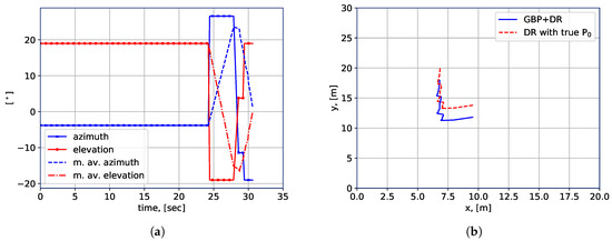 Further, the performance of the LHO algorithm can be improved or degraded largely depending on the accuracy of the location awareness. In other words, when the positioning accuracy is high and reliable enough according to the environment and requirement, the LHO in general can achieve higher throughput than the RSSI-based handover. In the experiment, we apply the proposed GBP algorithm to compute only the initial location of the robot, thereafter, DR is applied for the location estimation of the rest of the trajectory. This is done because of the large errors of the measured AoA at the output of the antenna array, as shown in Figure 9a. By comparing Figure 9a,b, it is clear that the AoA measurements acquired by the robot do not reflect the changes of the AoA with a sufficient accuracy. Hence, standalone-GBP cannot provide adequate AoA accuracy for a reliable positioning accuracy and is therefore applied only to calculate the initial robot location. In terms of the reasons for the large errors of measured AoA, we provide the following elaborations. First, the employed mmWave equipment does not allow for continuous and “smooth” control over the array directivity. Instead, the used array has several fixed configurations, each corresponding to a particular vertical and horizontal direction of the main lobe. Each configuration covers approximately 10 degrees in the horizontal and vertical planes, which significantly decreases the accuracy of the LRMs, i.e., the AoAs. Second, we do not have access to the beam-searching algorithm, which makes it difficult to evaluate if the utilized configuration corresponds to a direct link or to a reflection from the wall or another object.