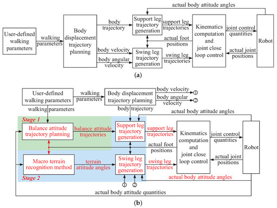 Usually, during a basic walking process of a legged robot, the body displacement trajectory is planned based on the user-defined walking parameters. Based on this trajectory, the trajectories of the support legs are generated. The trajectories of the swing legs are designed in the body coordinate with only the body velocity and angular velocity considered. Then, through the kinematics computation and joint close loop control, the robot is driven to move with no walking attitude regulation. The basic control scheme which is commonly employed for a legged robot is shown in Figure 3a. Due to the none regulation of the walking attitude, the walking balance of the robot cannot be ensured.