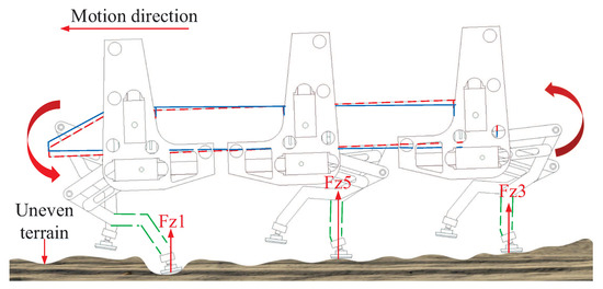 During a hexapod walking process, especially when the large-size robot is walking on soft terrain, will be very easily changed by some unpredictable disturbances (e.g., the deformations of the robot legs, the deformation of the terrain and the big contact impacts between the robot legs and the terrain), as shown in Figure 4. If small body attitude deviations are not adjusted in time, the deviations will increase as the robot moves further. Even worse, the robot may lose motion stability, and irreversible damage may occur. To solve this problem, a 6-order polynomial interpolation method is employed to plan the balance angle attitude trajectory of the robot. The planned attitude trajectory is shown in Equation (4):