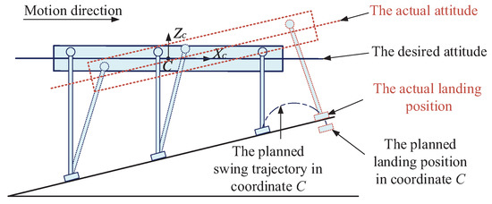 As discussed in the introduction, for most currently developed legged robots, the swing leg trajectory is usually designed in the body coordinate C without considering the terrain attitude angles. When facing the slope walking situation, the early landings of the swing legs may occur. The swing legs with the unchangeable landing positions with respect to the robot body coordinate C will keep moving to the planned landing positions and force the robot body to be parallel to the slope surface. Therefore, the attitude adjustment process with special user-defined desired attitude angles will be hindered. The contradiction between the unchangeable landing positions of the swing legs and the attitude adjustment process will further affect the motion balance of the robot, as shown in Figure 6.