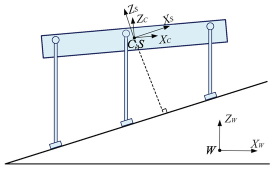 where represents the rotation transformation matrix of the slope coordinate S with respect to the global coordinate W. has the same form as shown in Equation (10), and consists of the actual yaw angle , the actual pitch angle , and the actual roll angle of the slope coordinate S.