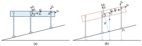 To obtain the landing foot position, velocity, and acceleration of the swing leg, a hypothetical foot position of a support leg relative to the robot body when the robot is standing still is designed first. Assuming that the robot body is parallel to the slope when the robot is standing still on the slope, a hypothetical base coordinate of leg i with the same directions as the slope coordinate can be obtained, as shown in Figure 8b. At this moment, when the line between the foot and the hypothetical base coordinate of the leg is parallel to the direction of the gravity, the projection of the CoM of the robot body in the polygon formed by the support feet is close to the center of the support polygon, and better stability of the robot can be ensured. Based on this hypothetical posture of the robot, the foot position of leg i in coordinate can be obtained, as shown in Equation (28):