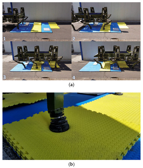 The walking parameters employed in the experiment is shown in Table 2. The artificial soft terrain walking process of the large-size hexapod robot is shown in Figure 10a. The artificial soft terrain was mainly constructed of EPE plates. The size of each EPE plate is 1 m × 1 m × 0.02 m. Two layers of the blue EPE plates were used to construct the basement of the terrain. Several yellow EPE plates and two plywood plates were randomly placed on and beside the terrain basement to simulate the uneven characteristics of the natural terrains. The thickest part of the terrain was constructed of five layers of the EPE plates. Obvious deformation of the EPE plate being compressed could be seen during walking, as shown in Figure 10b. Therefore, the artificial soft terrain can pose a great challenge to the walking balance of the robot.