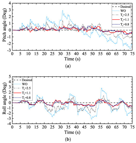 According to the theoretical design of the attitude trajectory optimization method proposed, the attitude deviation adjustment time needs to be defined by users if a good attitude regulation performance is wanted to be ensured. Figure 11 shows the regulation performances of the pitch and roll angles of WT with different defined. The max absolute tracking errors and the standard deviations of the attitude angle regulation processes are shown in Table 3, where Max. Abs. TE represents the max absolute tracking error, and Std. Deviation represents the standard deviation.