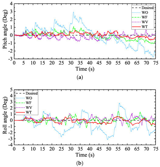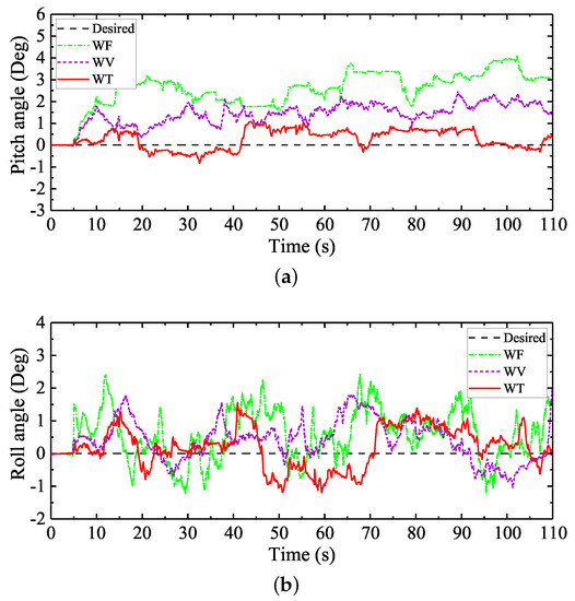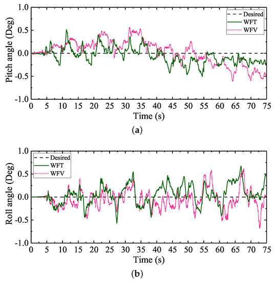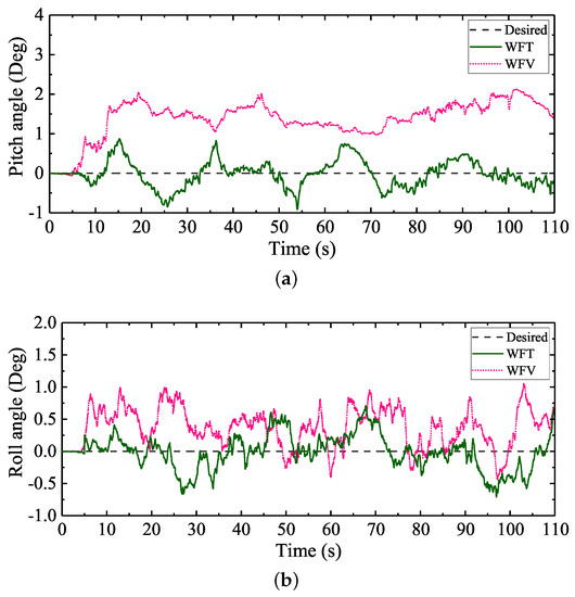 The attitude regulation performances of the pitch and roll angles under WFT and WFV: (a) the body pitch angle comparison and (b) the body roll angle comparison.