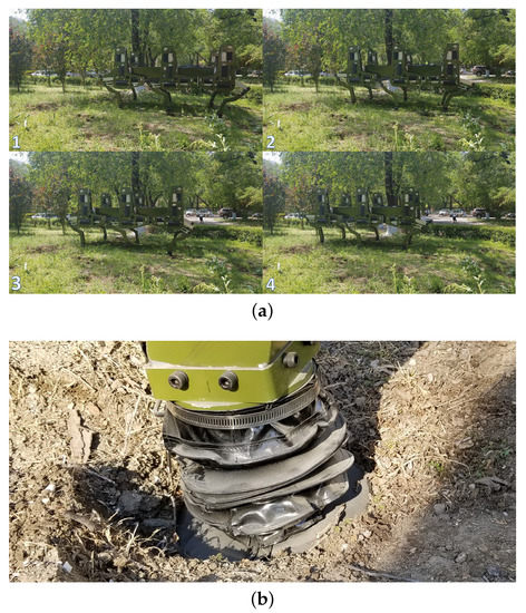 The snapshots of the natural soft terrain walking experiment: (a) the natural soft terrain walking process and (b) the foot sinkage caused by the deformation of the natural soft terrain.