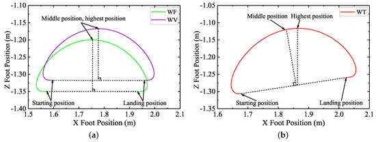 The planned swing trajectories of leg 1 in the robot body coordinate C during one gait cycle: (a) the planned swing trajectories of leg 1 with WF and WV employed and (b) the planned swing trajectory of leg 1 with WT employed.