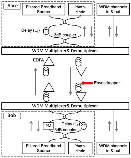 Figure 1 shows the experimental setup of the key generation system, which consists of two Mach–Zehnder (MZ) delayed interferometers. The synchronized key signals are the results of the interference from interferometers at both ends. Both Alice and Bob send and receive signals with phases affected by the local temperature changes and mechanical vibrations. Since the signals in both directions go through the same path, the phase fluctuations and the interference results at the MZI outputs are the same at both ends, making key sharing possible. Broadband sources are used as the signal carriers to prevent the eavesdropper from measuring the phase directly with coherent detection. In the experiment, both Alice and Bob use a filtered amplified spontaneous emission (ASE) with bandwidth 150 GHz and center wavelength 1547.6 nm as the light source. Since the broadband source has short coherence length, which is 2 mm, the optical delays placed in Alice’s (L1) and Bob’s (L2) interferometers have to be matched within the 2 mm range to recover the phase information for key generation [14]. The optical delays used in the proposed system are typically in the range of tens of kilometers. Without knowing the delays in the interferometers, it is extremely difficult for the eavesdropper to scan the optical delays and find the coherence length in mm resolution. The delays (L1 and L2 in Figure 1) range from 20 m to 26 km in the experiment, which means the eavesdropper has to find a 2 mm range in up to a 26 km range in order to find the matching condition. More importantly, it should be noted that by building another fiber interferometer for eavesdropping, new phase randomness is created in addition to the transmitted phase information, thus reducing the accuracy of the eavesdropper’s measurement of the phase information.