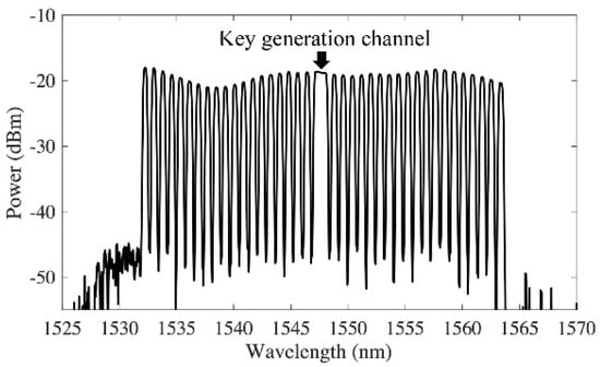 We demonstrated the transmission of the key distribution channel with 38 WDM channels using standard C-band transmission window. The key generation system is tested in both back-to-back transmission and a 240 km link. The 240 km bidirectional fiber-pair link includes three 80 km standard single mode fiber (SSMF) spans, each with erbium-doped fiber amplifier (EDFA) to compensate the average fiber loss of 17.5 dB. The 38 dummy WDM channels were emulated by carving another ASE source using a flexible-band wavelength selective switch (WSS) at 100 GHz spacing (Figure 2). The spectrum shows that the power spectral density (PDF) of the key distribution channel is comparable to the PDF of the other WDM channels, so the key generation channel can be downloaded from the network by using a bandpass filter with the same power extinction ratio as the standard WDM filters.