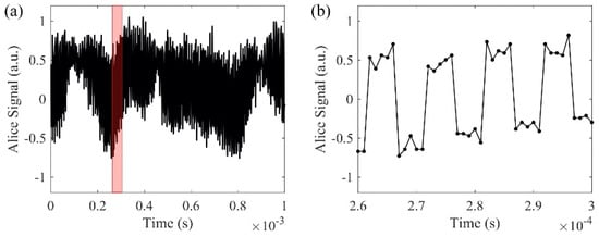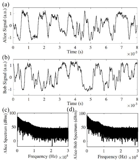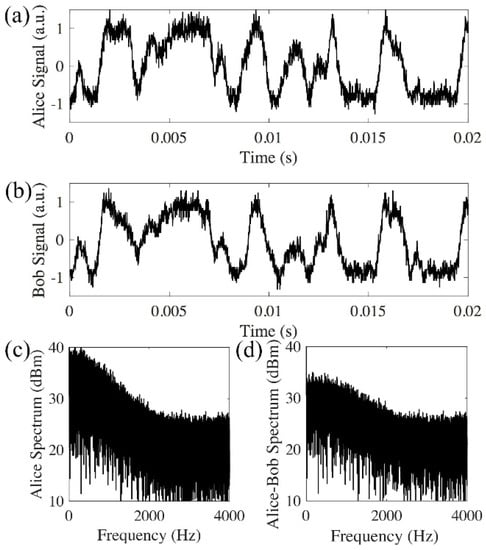 When 26 km optical delays are applied by both Alice’s and Bob’s MZIs, the two interference results by direct photo-detection match each other in back-to-back testing (Figure 3a,b). The phase randomness is generated from the 26 km optical delays deployed by both Alice and Bob. The spectrum analysis further proves the matched signal. Figure 3c is the spectrum of signal received by Alice, and shows that the signal exhibits frequency content up to 2 kHz. Figure 3d is the differential spectrum between the received signals, and is obtained by the Fourier transform of Alice’s signal minus Bob’s signal. The comparison between Alice’s spectrum (Figure 3c) and the differential spectrum (Figure 3d) shows that Alice’s spectrum is significantly larger than the differential spectrum up to 1 kHz, which further proves that Alice’s signal matches with Bob’s signal up to 1 kHz.