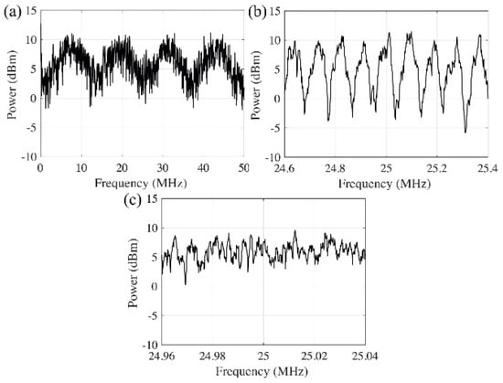 To determine the appropriate delay length that can defend the spectral-fringe-based attack, we emulate the eavesdropper (red arrow in Figure 1) and perform the attacks to the systems with different delay lengths. An ultra-stable fiber laser with 400 Hz linewidth is used as the local oscillator (LO) for the coherent detection. The Fourier transforms of the coherently detected signals show that when 20 m and 2.3 km delays are used (Figure 5a,b), the fringes in the spectrum can be clearly identified to track the phase fluctuation information within the interferometer. As for the 26 km delay, the fringes are smeared out by the fast-changing phase due to the long measurement time frame needed to achieve the frequency resolution required (Figure 5c). The experimental results show that the delay length of the fiber interferometer has to be longer than a few kilometers in order to protect against coherent detection attack.