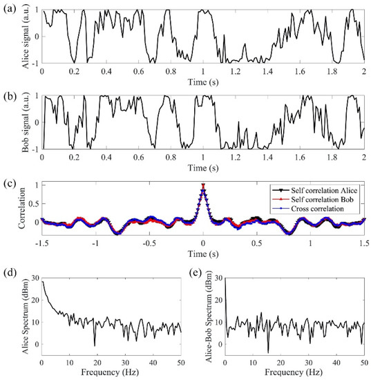 (a,b) are the received signals from Alice and Bob with high-frequency phase fluctuations filtered; (c) shows the self-correlations and cross-correlation of the signals; (d) Alice’s spectrum; (e) differential spectrum between Alice and Bob has a much smaller amplitude than Alice’s spectrum.