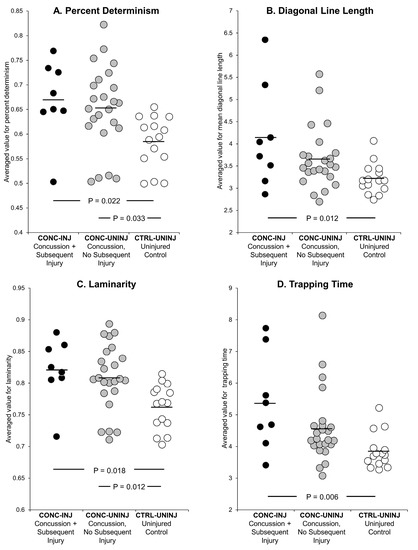 Distribution of individual data points for each of the nonlinear (CRQA) measurements obtained during the assessment after return-to-play clearance. The black bars represent the mean value in each group.