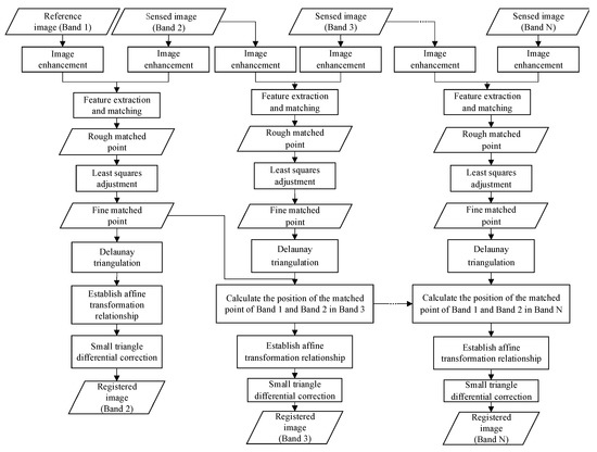 Based on the above steps, the coordinates of the matching points for Band 1 and Band 2 are derived in Band 3 using the transfer strategy based on the affine transformation relationship between adjacent bands. Thus, Band 3 can be regarded as being adjacent to Band 1. The registration of Band 3 can then be performed using the differential correction method based on dense Delaunay triangulation. The coordinates of matching points in Band 1 and Band 2 can be calculated for Band N, which allows for the registration of Band N.
