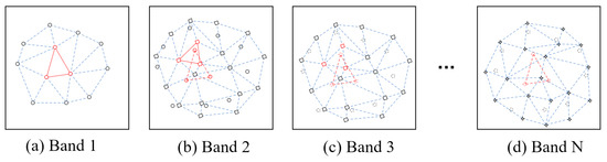 Figure 7 displays a schematic diagram of full-spectrum registration. In the figure, the reference image is Band 1. The solid circle points in Figure 7a,b are the matching point pairs in Band 1 and Band 2. The diamond-shaped points in Figure 7b,c are the matching point pairs in Band 2 and Band 3. The quadrangular points in Figure 7d are the matching point pairs in Band N-1 and Band N. The dotted circle points in Figure 7c,d are the matching points (solid circle points) in (b) in Band 3 and Band N.